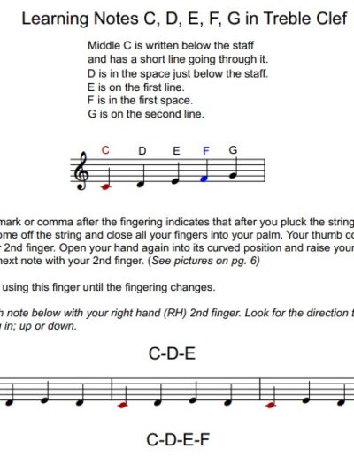 This easy to follow book starts from the very beginning. You will learn the names of the strings, begin to read music, count rhythm, and play songs. It’s very user-friendly and a great first book for children and adults! 39 pages. If printing, print in color and make into a booklet with odd pages on the left