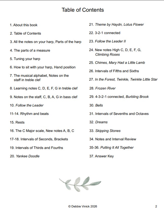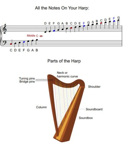This easy to follow book starts from the very beginning, teaching you proper hand position, note reading, and music theory. It’s a very user-friendly book that will get you off to a great start playing your harp! 37 pages. If printing, it’s best printed in color. Tape pages back to back in a booklet form with odd pages on left. If downloading onto a tablet, consider using a music file app like ForScore.